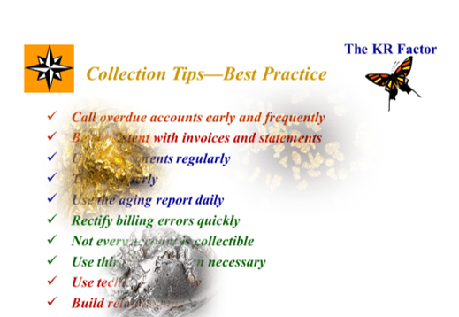 Here are some of the collection tips and best practices that I will consider in the course to help expedite cashflow: